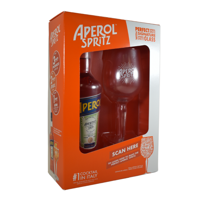 The glass bottle serves as the primary packaging holding the Aperol, while the folding carton enclosing the kit functions as the secondary packaging, organizing the products and enhancing presentation.
