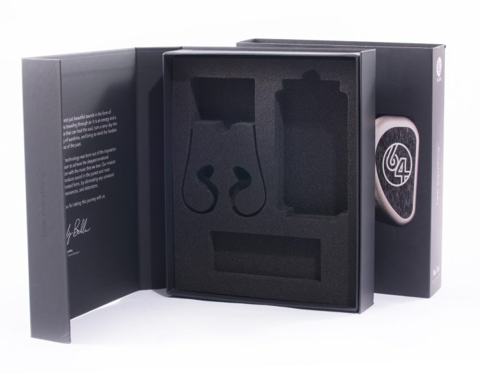 The headphones are housed in a rigid box, which acts as the primary packaging, with a foam insert securing the product for added stability and protection.