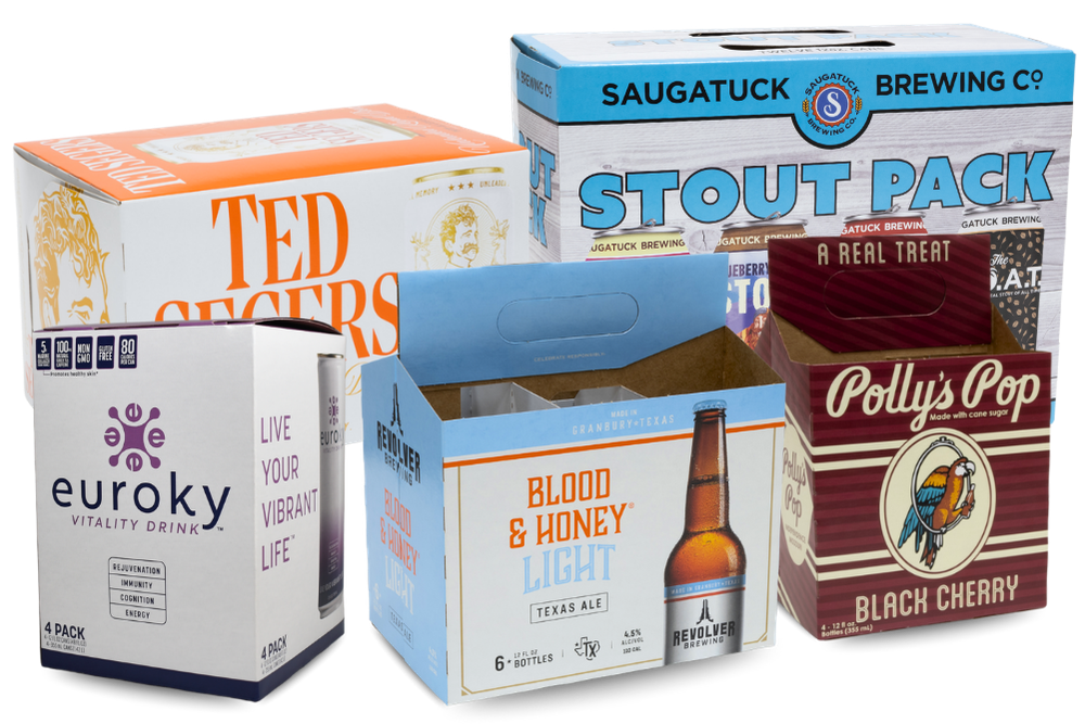 Custom printed beverage boxes and bottle carriers for beer, seltzer, soda, and other beverage brands.