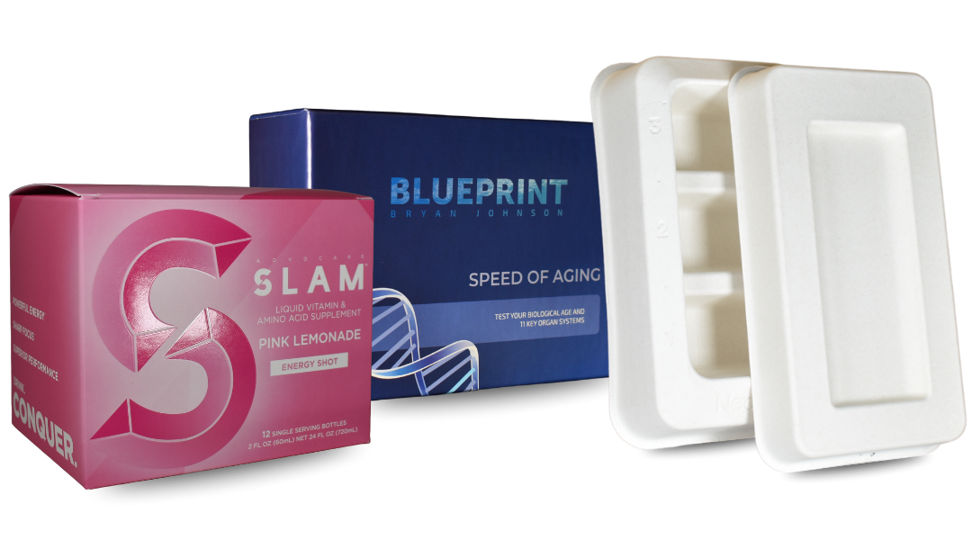 Custom secondary packaging for health, wellness, and supplement brands, including premium folding cartons, rigid boxes, and molded pulp.