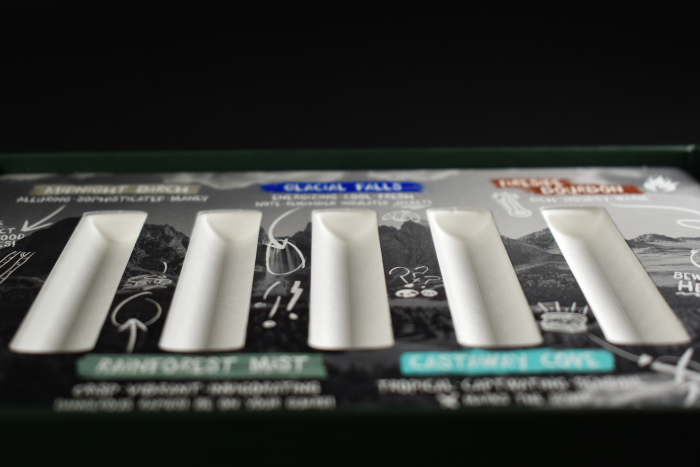 To minimize tooling and production costs, Wynalda designed a single universal molded pulp tray that could be used for both the 3-bottle and 5-bottle discovery packs. We developed two different SBS masks for the pulp trays: one exposing all five cavities, and one exposing only three. The masks are printed with four-color process plus two custom colors and finished with dull varnish. They are then die-cut and glued to the molded pulp trays.