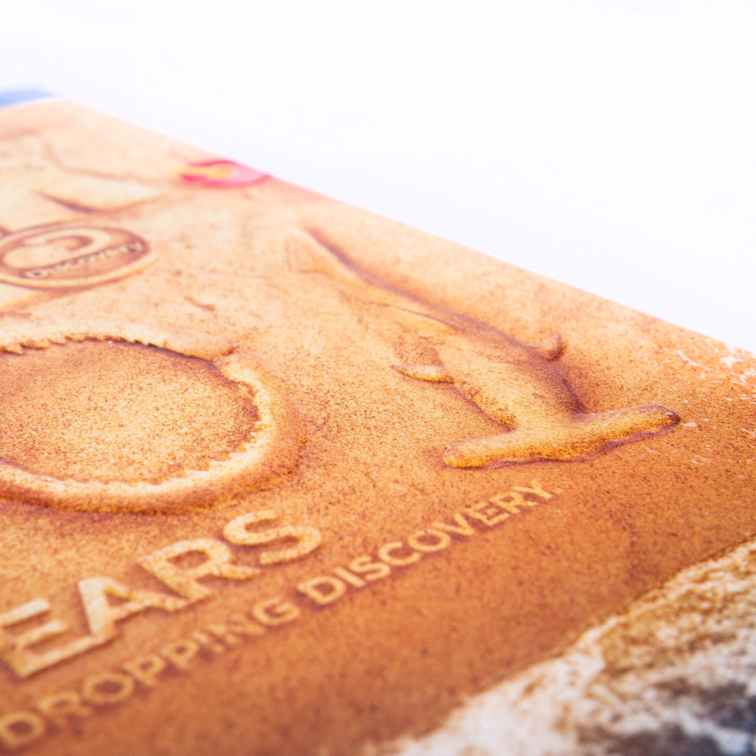The final touch used to bring the visual to life was sculptured embossing. The sculptured embossing of the key elements such as the shark, jaws and seal as well as the minor elements like the small castle, sand bucket and shovels and the life ring, made the images in the sand come to life as if they were just carved out of the sand.