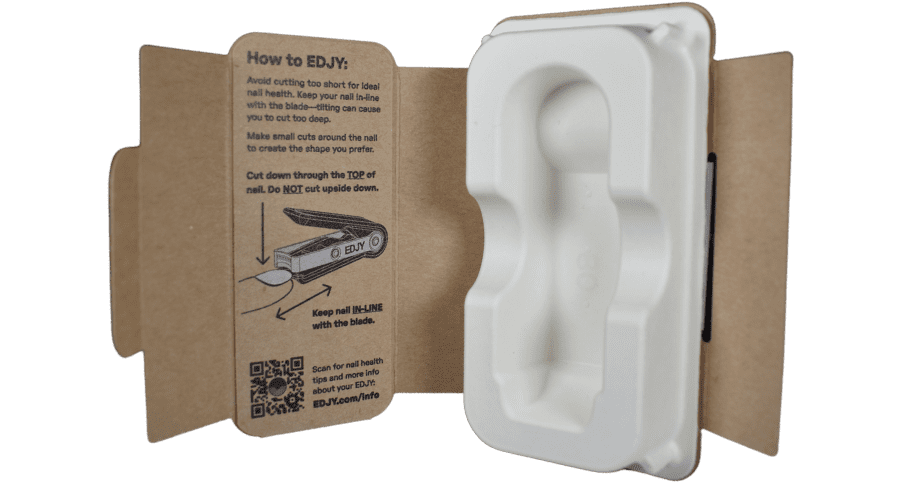 Cost-Effective, Domestic Solution: By eliminating the rigid box and transitioning to molded pulp and paperboard, EDJY reduced their packaging costs while still delivering a premium experience to their customers. All packaging manufacturing took place at Wynalda’s Michigan facility, using domestically sourced materials, aligning with EDJY’s commitment to American-made excellence.
