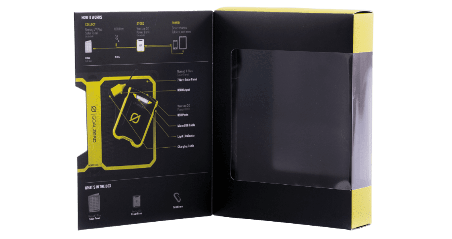Goal Zero needed packaging that allowed consumers to view the solar recharger from multiple angles while still providing enough print space to highlight features, benefits, and instructions. The structural challenge: maximize product visibility without sacrificing space for critical information.